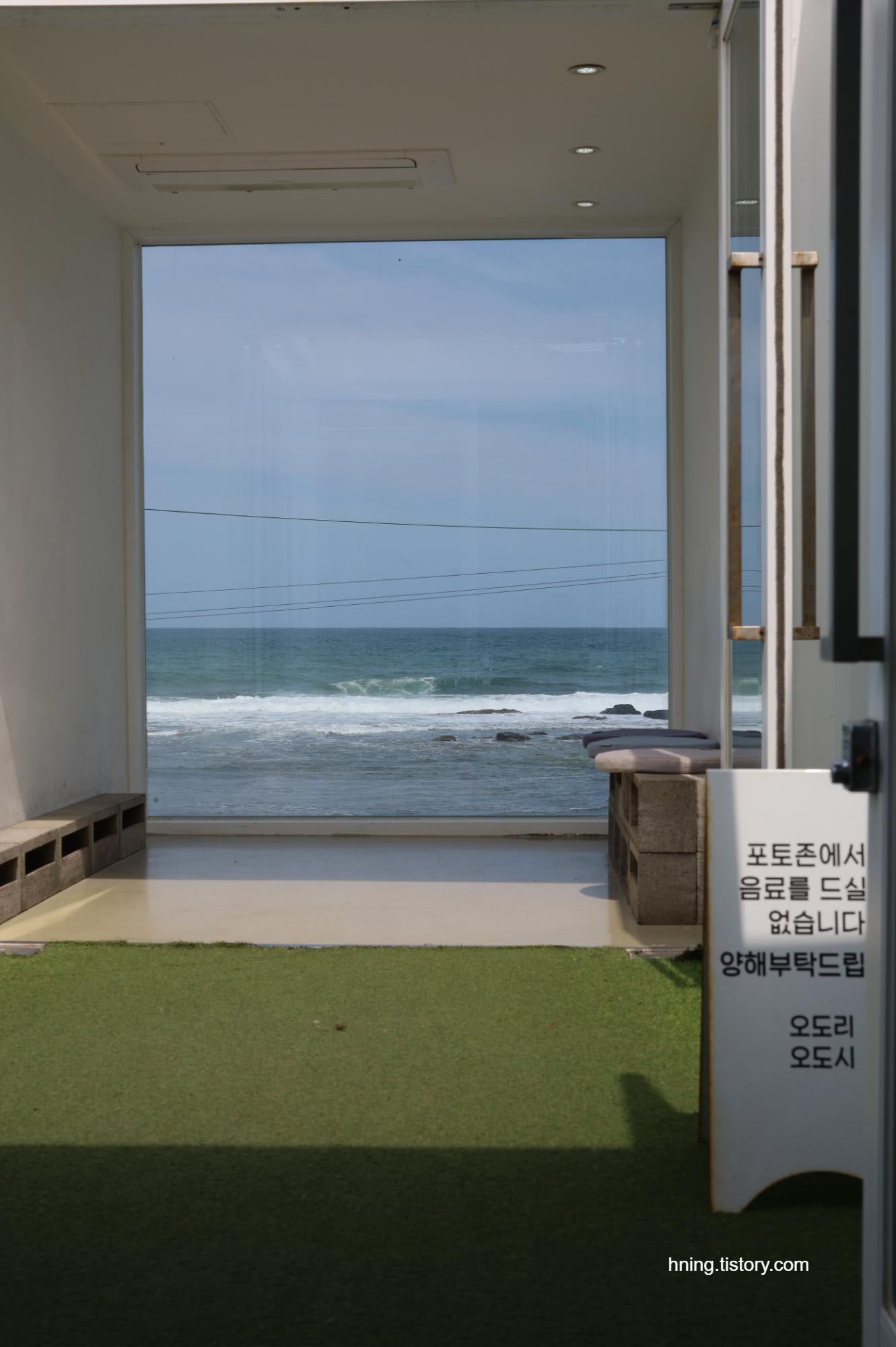 오도리 오도시 카페 앞에 주차를 하고 바라보면 이런 모습이 반겨준다. 아마 컨테이너를 이용해서 올린 건물인것 같다. 아이디어가 좋은 것 같다. 이런 카페의 외관은 처음이라서 신선하게 느껴졌다. :)주차를 하고 바라본 동해 바다의 모습. 구름이 아주 예쁜 하늘은 아니었지만, 그래도 회색빛은 아니고 파란 하늘이어서 다행이었다. 하늘과 바다가 너무 예뻤다.조금만 오른쪽으로 고개를 돌려보면 포스코와 여러 공장들이 있는 포항 앞바다 특유의 풍경을 감상할 수 있다. :)카페 곳곳에서 신경써서 컨셉을 갖고 꾸몄다는 느낌을 받을 수 있다. 글자 폰트부터 건물 밖에서부터 보이는 벽돌, 의자, 귀여운 인형, 흰색으로 깔맞춤된 색깔들. 예쁘다.주차장에서 카페 입구 바로까지 올라와서 바다쪽을 다시 바라보면 난간과 함께 이러한 풍경이 보인다.주문을 마치고 주문대 왼쪽에 있는 케이크들과 우유 진열장들을 찍어보았다. 오도우유 케이스부터 케이크까지, 먹을 것들이지만 참 예쁘게 잘 만들었다. ^^마샬 스피커에서 음악을 틀어주다니. 내 기억에 마샬 스피커로 음악 틀어주는 카페는 제주도 이후로는 처음인 것 같다. 보통 프랜차이즈 카페에서는 볼 수 없는 아이템이다. 그리고 재밌는 점이 음료와 케이크 쟁반이 약간 독특한 트레이에 담겨져서 나온다. 이색적이고 좋았다. 1층 주문대에서 앉는 자리로 가기위해서 몸을 돌리면 보이는 선반이다. 오도리 오도시라고 적힌 담요가 두 개 있어야 하는데, 옥상에 계신 분들이 덮고 계셔서 사진에는 없는 모습이다. 개인적으로 미니멀한 인테리어, 익스테리어를 좋아하는데 내 취향에 잘 맞는 인테리어 소품들 같다.인스타에서 그렇게 유명하던 2층의 포토존으로 오면 보이는 모습이다. 날씨도 좋고 사람도 없어서 사진찍기에 참 좋은 날이었지만 찍어줄 피사체가 없어서 아쉬웠다. T^T2층 포토존에서 계단쪽을 바라보면 보이는 모습이다. 실내가 절대 넓지 않고 3인 이상 오면 앉기에 힘든 자리일 것 같다. 아마 단체로 오셨던 네 분이 앉아계셨던, 루프탑 테이블에 앉아야 할 것 같다.1층 화장실 앞에 있는 화분과 물.1층에 있는 벽돌 의자들. 보기와는 다르게 저런데 앉는게 사실 되게 편하다. ^^;;