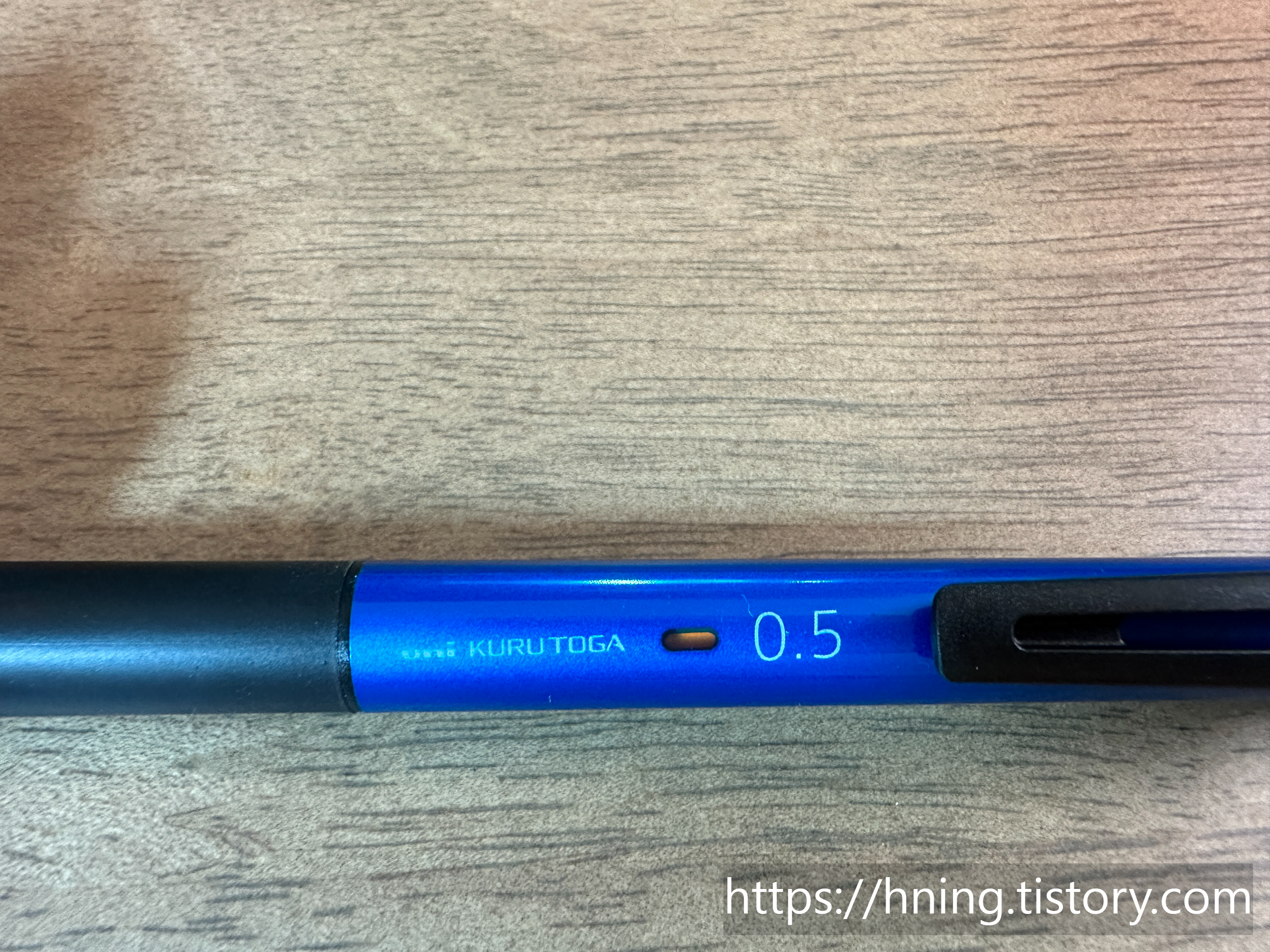 안타깝게도 뽑기가 잘못 걸렸다. uni KURUTOGA 0.5 프린트가 삐딱하게 되어있다.