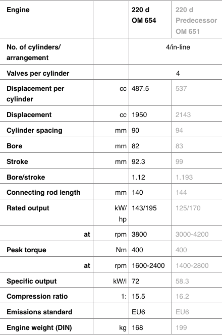 위의 표를 살펴보면 OM651 에서 OM654로 바뀌면서 실린더 공간, 보어, 스트로크, 배기량 모두 감소하였으나 정격 출력이 170 마력에서 195마력으로 증가하였음이 보인다.
